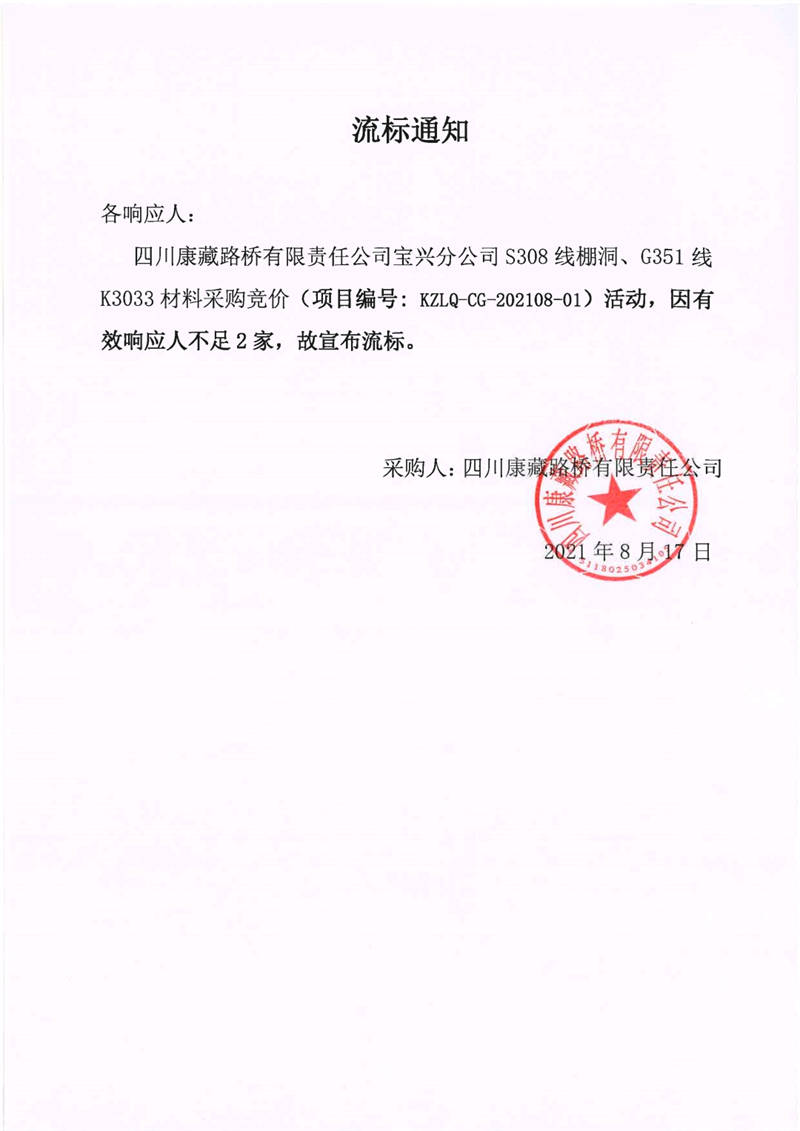 四川康藏路橋有限責任公司寶興分公司S308線棚洞、G351線K3033材料采購競價流標通知