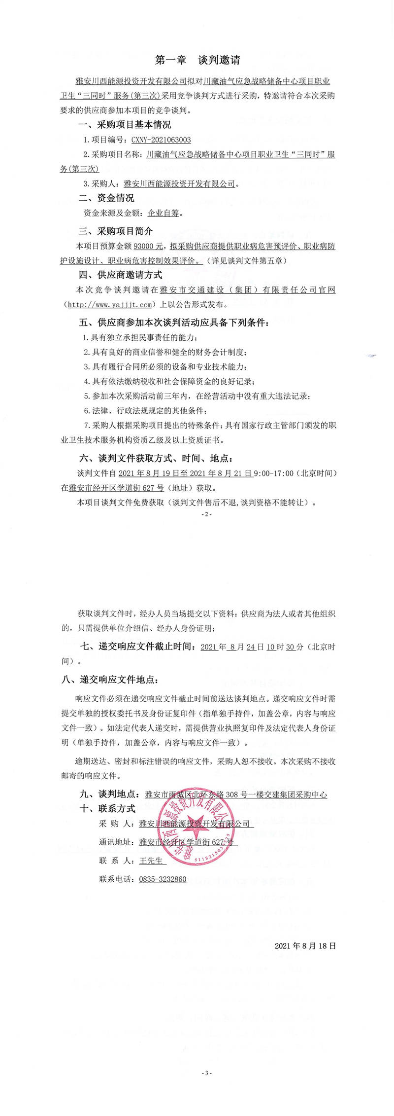 雅安川西能源投資開發(fā)有限公司川藏油氣應急戰(zhàn)略儲備中心項目職業(yè)衛(wèi)生“三同時”服務(第三次)競爭談判