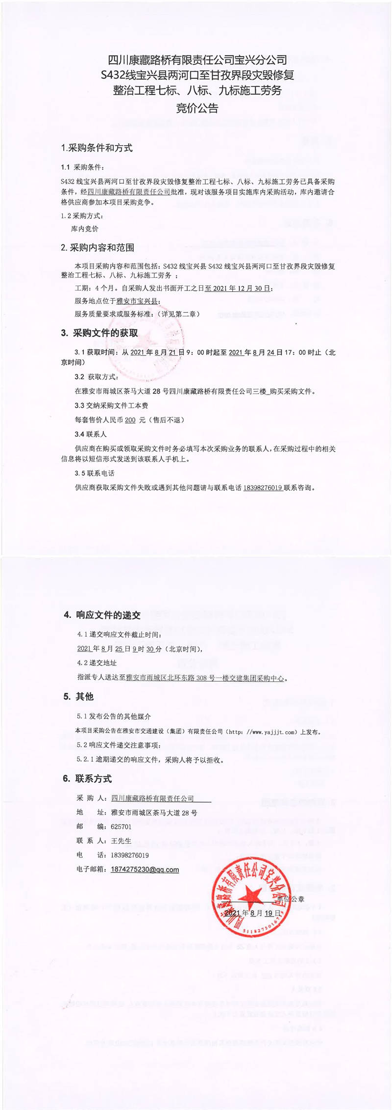 四川康藏路橋有限責任公司寶興分公司S432線寶興縣兩河口至甘孜界段災毀修復整治工程七標、八標、九標施工勞務競價公告