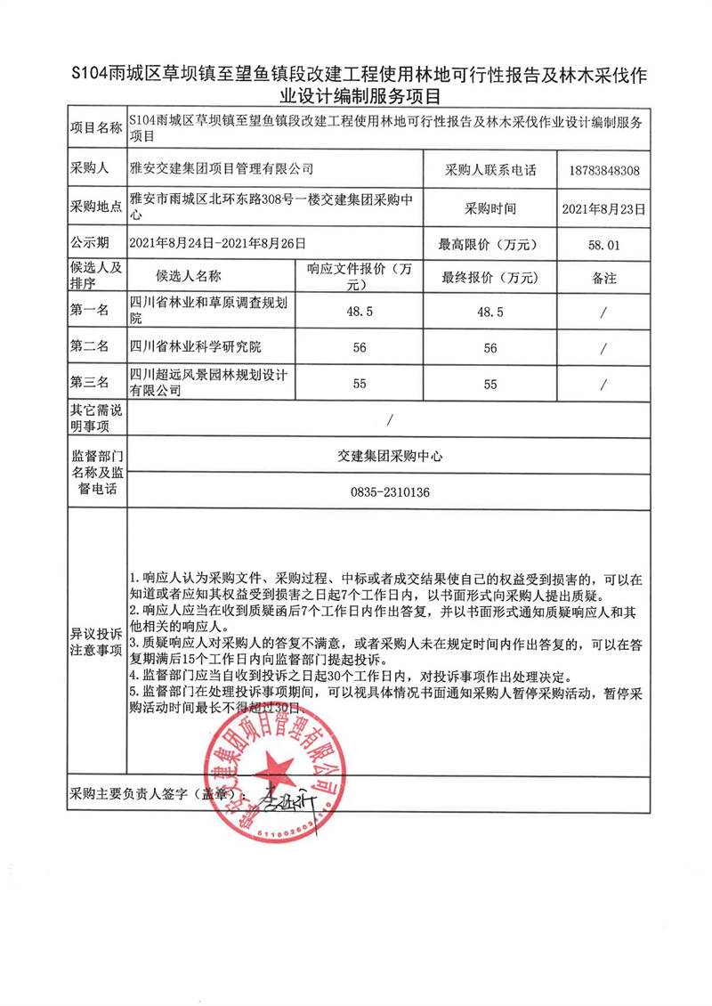 雅安交建集團項目管理有限公司S104雨城區(qū)草壩鎮(zhèn)至望魚鎮(zhèn)段改建工程使用林地可行性報告及林木采伐作業(yè)設計編制服務項目評審結果公示