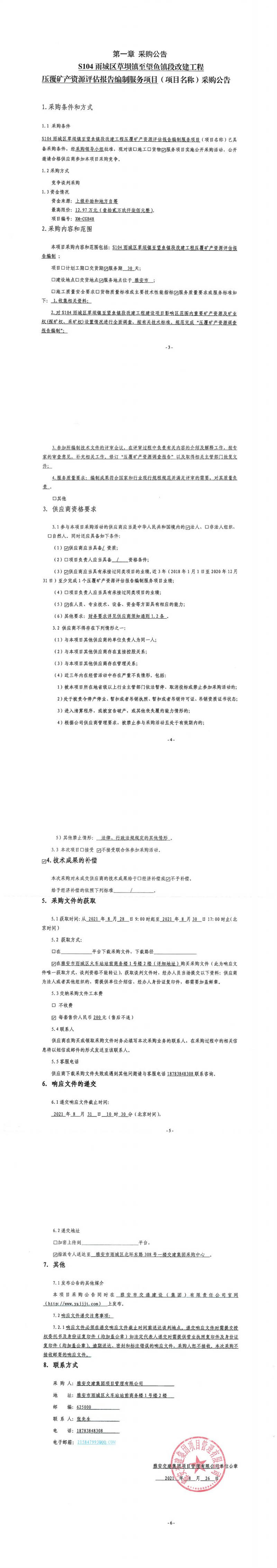 雅安交建集團(tuán)項(xiàng)目管理有限公司S104雨城區(qū)草壩鎮(zhèn)至望魚鎮(zhèn)段改建工程壓覆礦產(chǎn)資源評(píng)估報(bào)告編制服務(wù)項(xiàng)目采購(gòu)公告