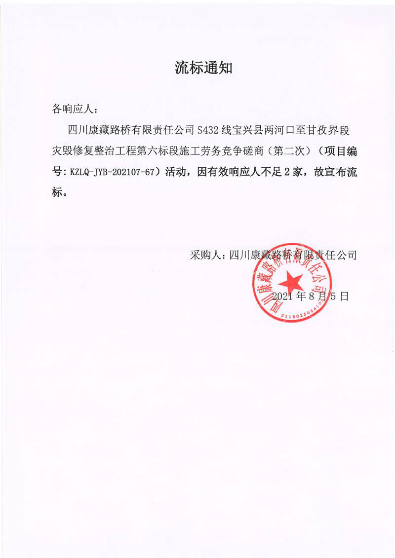 四川康藏路橋有限責(zé)任公司S432線寶興縣兩河口至甘孜界段災(zāi)毀修復(fù)整治工程第六標(biāo)段施工勞務(wù)競(jìng)爭(zhēng)磋商(第二次)流標(biāo)通知