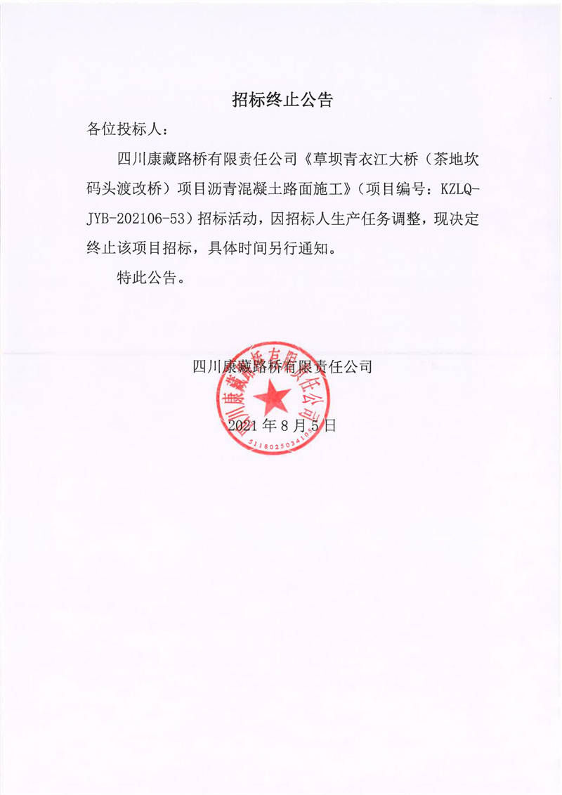 四川康藏路橋有限責任公司草壩青衣江大橋(茶地坎碼頭渡改橋)項目瀝青混凝土路面施工招標終止公告