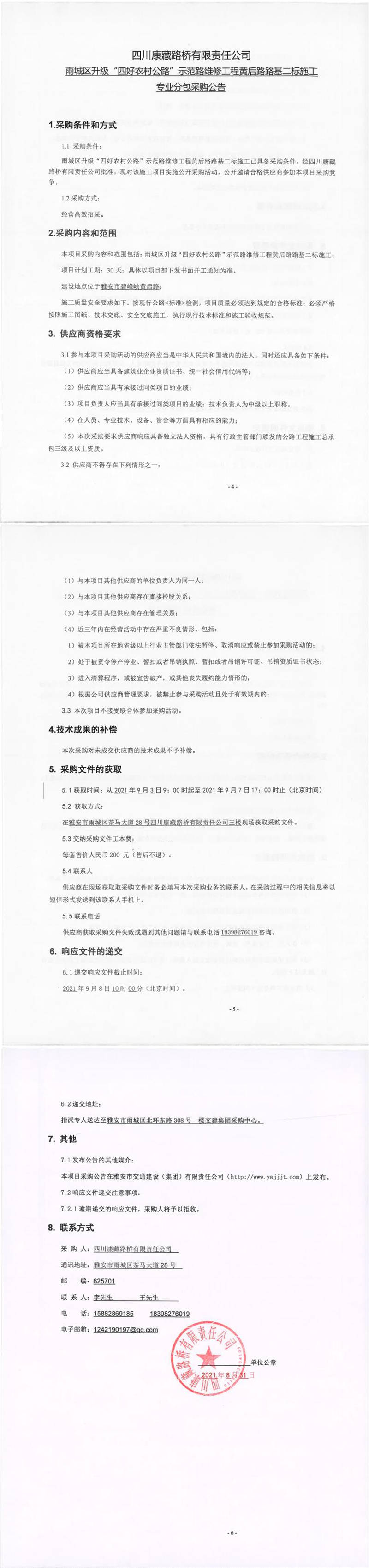 四川康藏路橋有限責(zé)任公司雨城區(qū)升級“四好農(nóng)村公路”示范路維修工程黃后路路基二標(biāo)施工專業(yè)分包采購公告