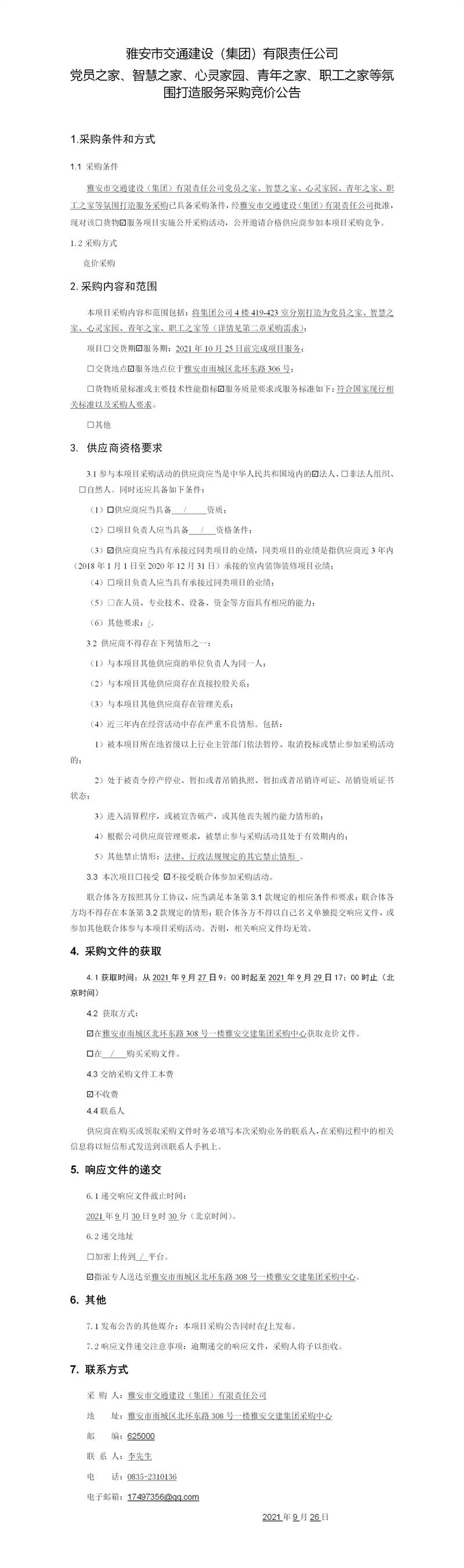雅安市交通建設(集團)有限責任公司黨員之家、智慧之家、心靈家園、青年之家、職工之家等氛圍打造服務采購競價公告