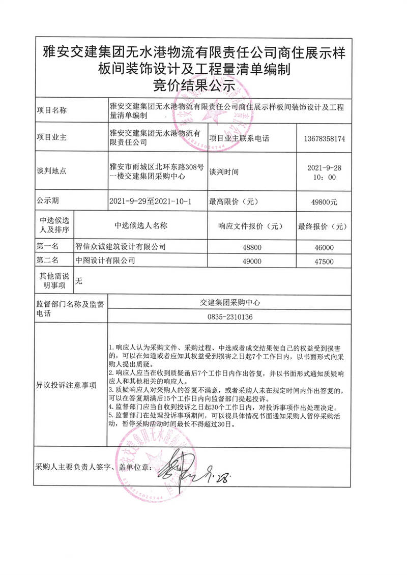 雅安交建集團無水港物流有限責任公司商住展示樣板間裝飾設計及工程量清單編制競價結果公示