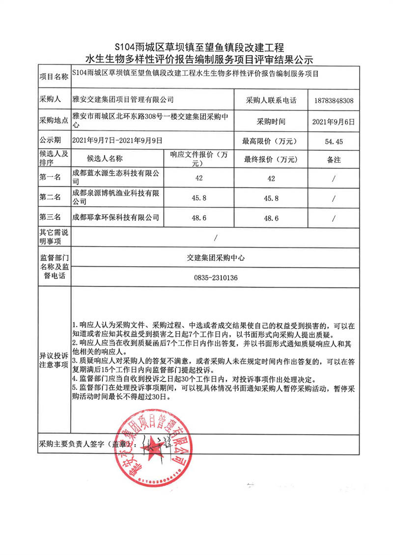 雅安交建集團(tuán)項(xiàng)目管理有限公司S104雨城區(qū)草壩鎮(zhèn)至望魚鎮(zhèn)段改建工程水生生物多樣性評價(jià)報(bào)告編制服務(wù)項(xiàng)目評審結(jié)果公示