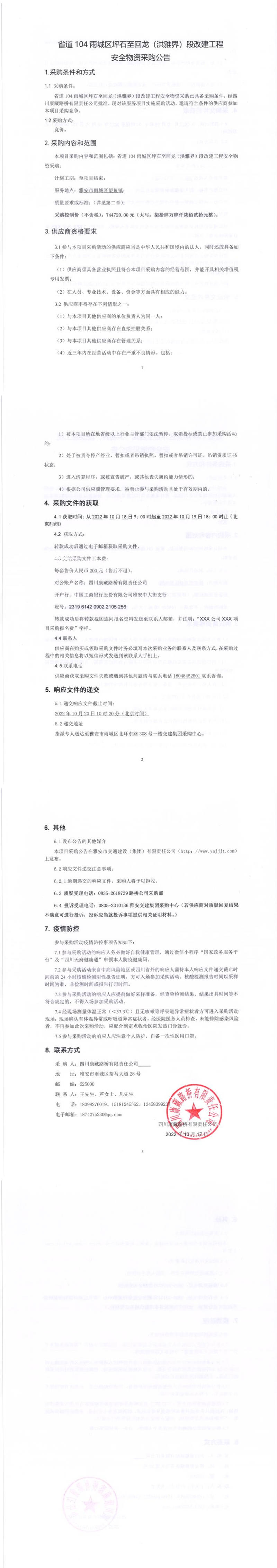 四川康藏路橋有限責(zé)任公司省道104雨城區(qū)坪石至回龍(洪雅界)段改建工程項(xiàng)目安全物資采購(gòu)公告