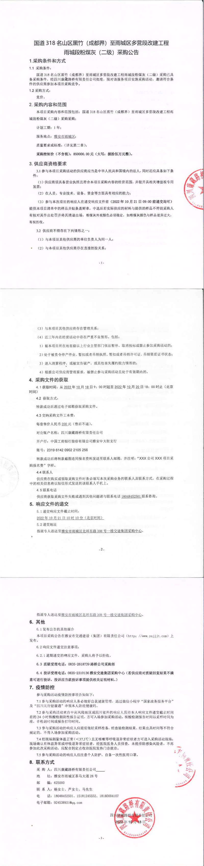 四川康藏路橋有限責(zé)任公司國道318名山區(qū)黑竹(成都界)至雨城區(qū)多營段改建工程雨城段粉煤灰(二級(jí))采購公告