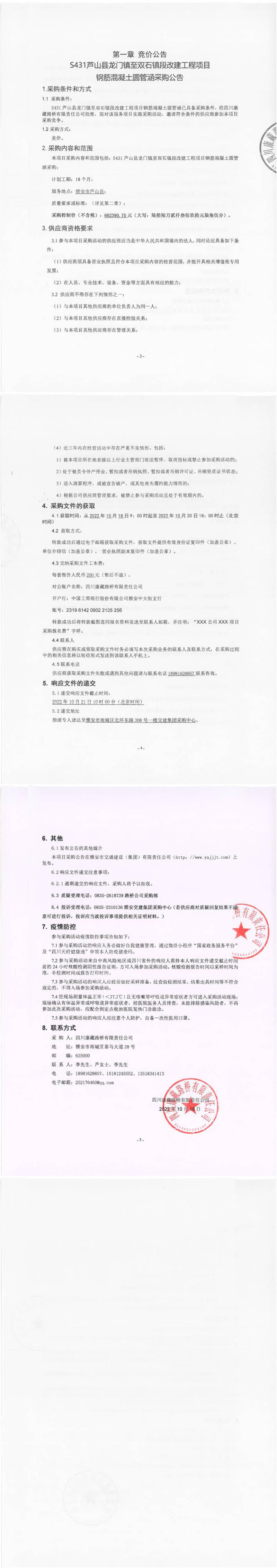 四川康藏路橋有限責(zé)任公司S431蘆山縣龍門鎮(zhèn)至雙石鎮(zhèn)段改建工程項目鋼筋混凝土圓管涵采購公告