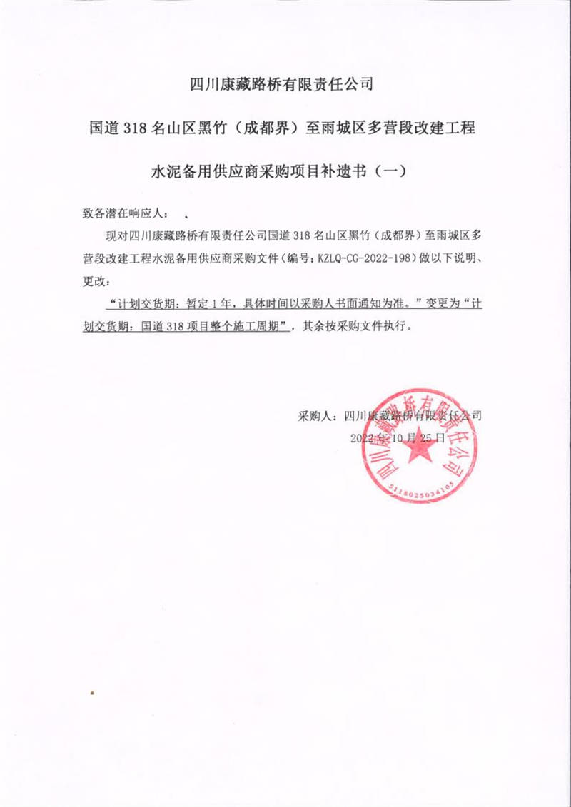 四川康藏路橋有限責(zé)任公司國道318名山區(qū)黑竹(成都界)至雨城區(qū)多營段改建工程水泥備用供應(yīng)商采購項(xiàng)目補(bǔ)遺書(一)