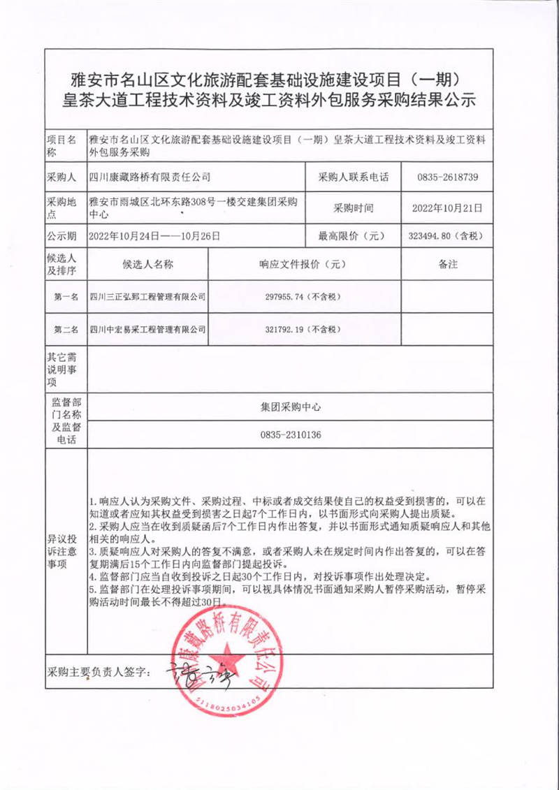 四川康藏路橋有限責(zé)任公司雅安市名山區(qū)文化旅游配套基礎(chǔ)設(shè)施建設(shè)項(xiàng)目(一期)皇茶大道工程技術(shù)資料及竣工資料外包服務(wù)采購(gòu)結(jié)果公示