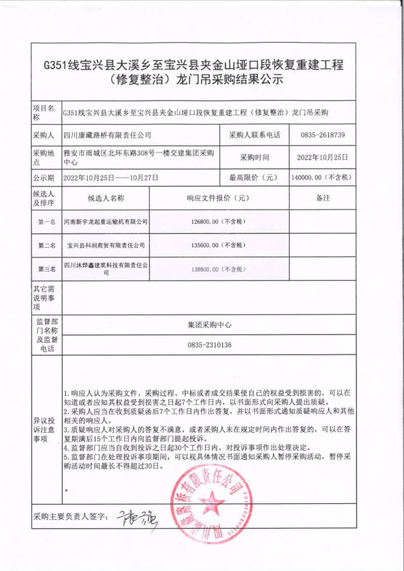 四川康藏路橋有限責任公司G351線寶興縣大溪鄉(xiāng)至寶興縣夾金山埡口段恢復重建工程(修復整治)龍門吊采購結果公示