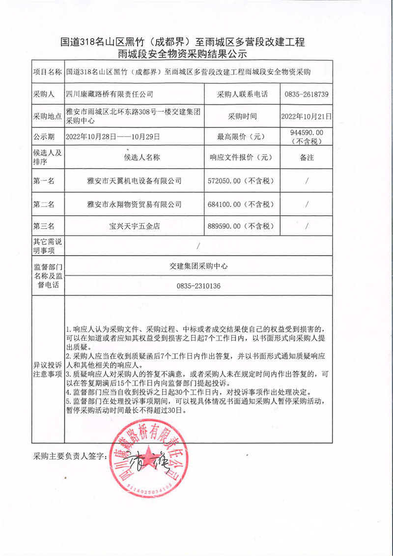 四川康藏路橋有限責(zé)任公司國(guó)道318名山區(qū)黑竹(成都界)至雨城區(qū)多營(yíng)段改建工程雨城段安全物資采購(gòu)結(jié)果公示