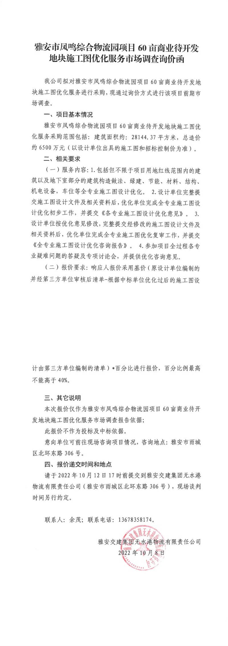 雅安交建集團無水港物流有限責任公司雅安市鳳鳴綜合物流園項目60畝商業(yè)待開發(fā)地塊施工圖優(yōu)化服務市場調查詢價函
