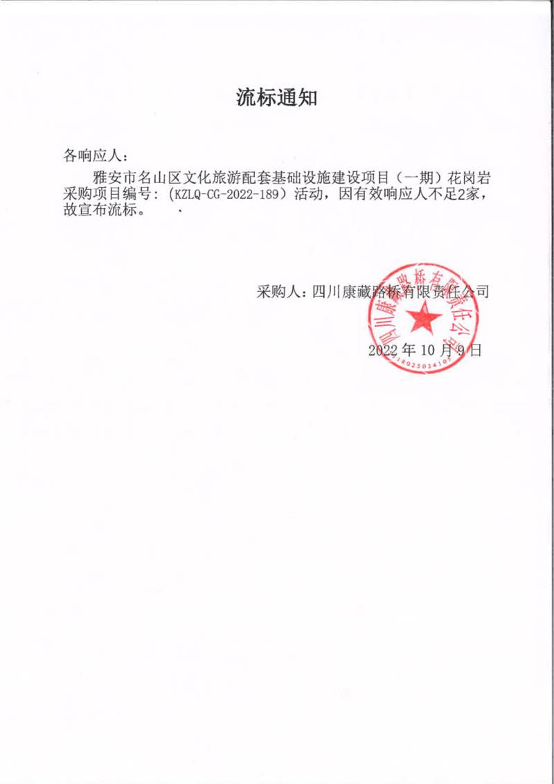 四川康藏路橋有限責(zé)任公司雅安市名山區(qū)文化旅游配套基礎(chǔ)設(shè)施建設(shè)項(xiàng)目(一期)花崗巖采購(gòu)項(xiàng)目流標(biāo)通知