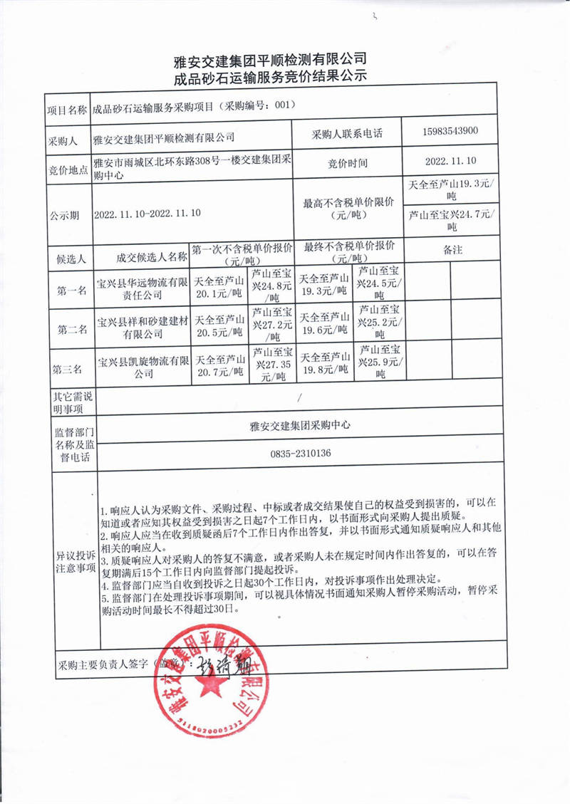 雅安交建集團(tuán)平順檢測(cè)有限公司成品砂石運(yùn)輸服務(wù)競價(jià)結(jié)果公示