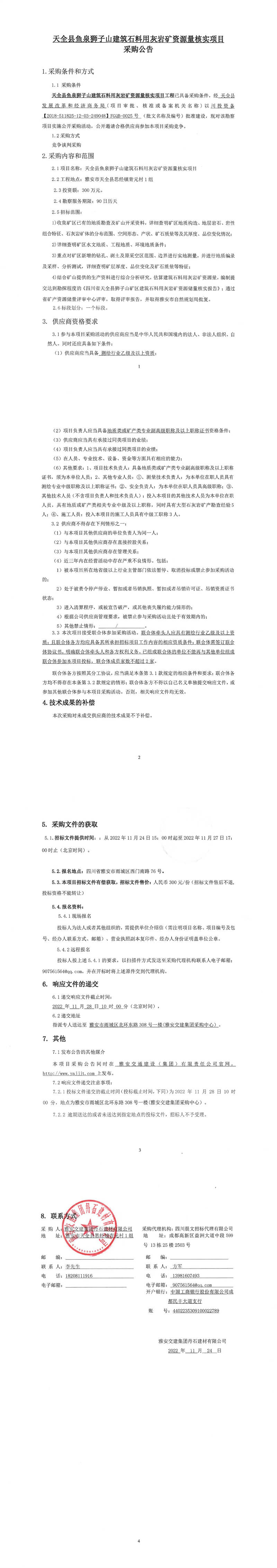 雅安交建集團(tuán)丹石建材有限公司天全縣魚泉獅子山建筑石料用灰?guī)r礦資源量核實項目采購公告