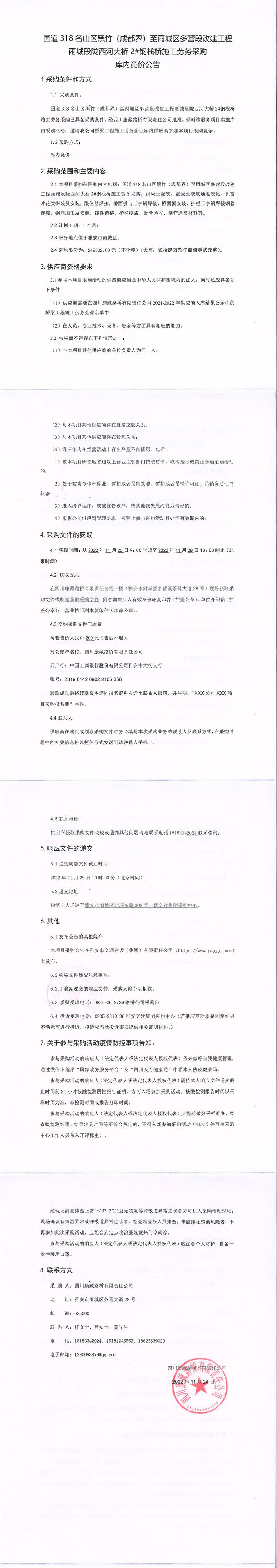 四川康藏路橋有限責任公司國道318名山區(qū)黑竹(成都界)至雨城區(qū)多營段改建工程雨城段隴西河大橋2#鋼棧橋施工勞務采購庫內(nèi)競價公告