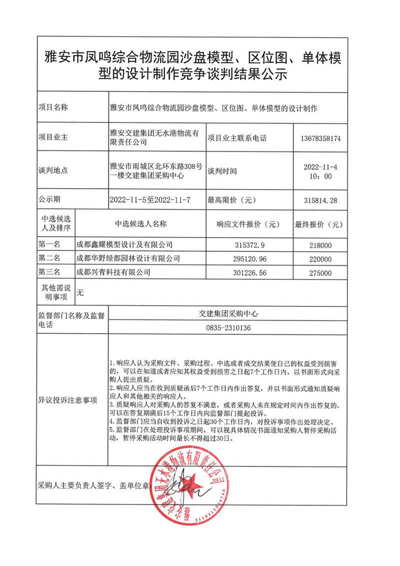 雅安交建集團無水港物流有限責(zé)任公司雅安市鳳鳴綜合物流園沙盤模型、區(qū)位圖、單體模型的設(shè)計制作競爭談判結(jié)果公示