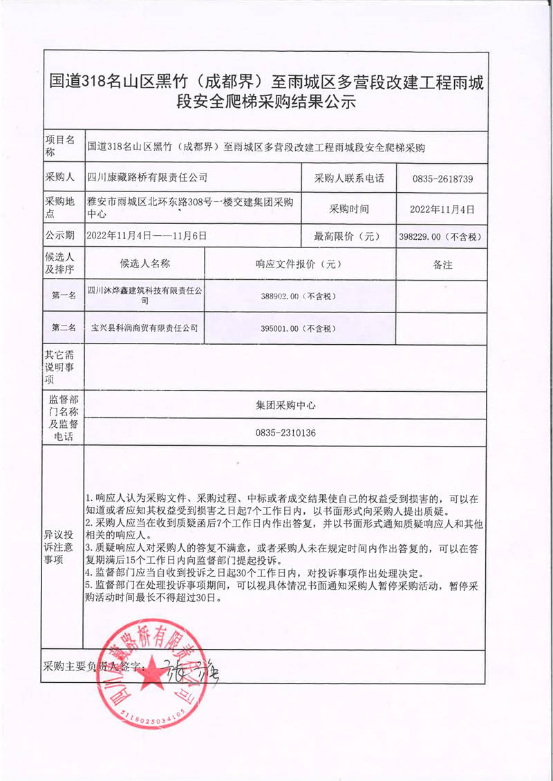 四川康藏路橋有限責(zé)任公司國(guó)道318名山區(qū)黑竹(成都界)至雨城區(qū)多營(yíng)段改建工程雨城段安全爬梯采購(gòu)結(jié)果公示