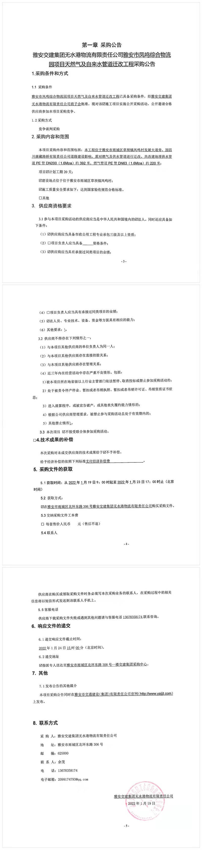 雅安交建集團(tuán)無(wú)水港物流有限責(zé)任公司雅安市鳳鳴綜合物流園項(xiàng)目天然氣及自來(lái)水管道遷改工程采購(gòu)公告