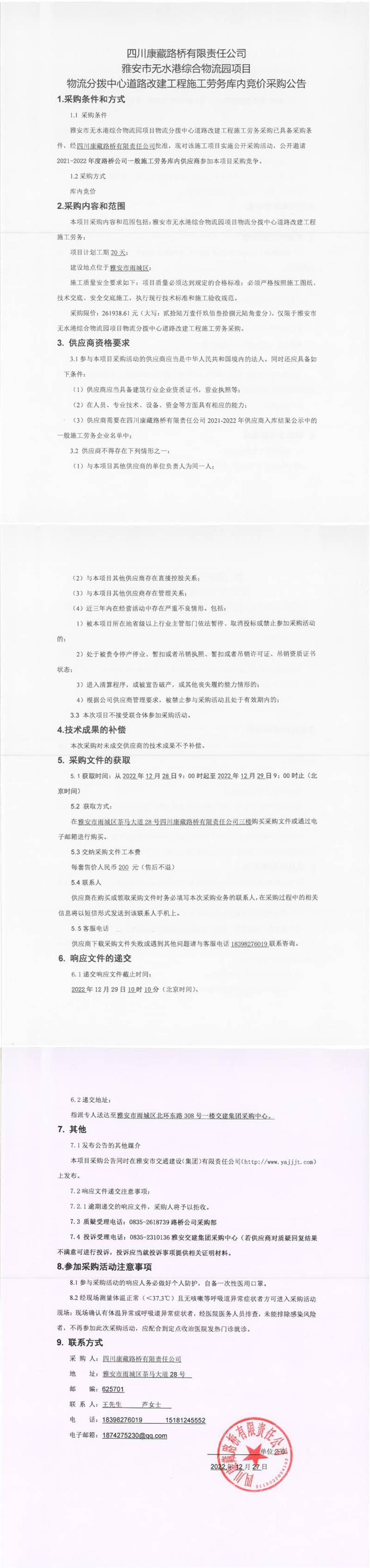 四川康藏路橋有限責(zé)任公司雅安市無(wú)水港綜合物流園項(xiàng)目物流分撥中心道路改建工程施工勞務(wù)庫(kù)內(nèi)競(jìng)價(jià)采購(gòu)公告