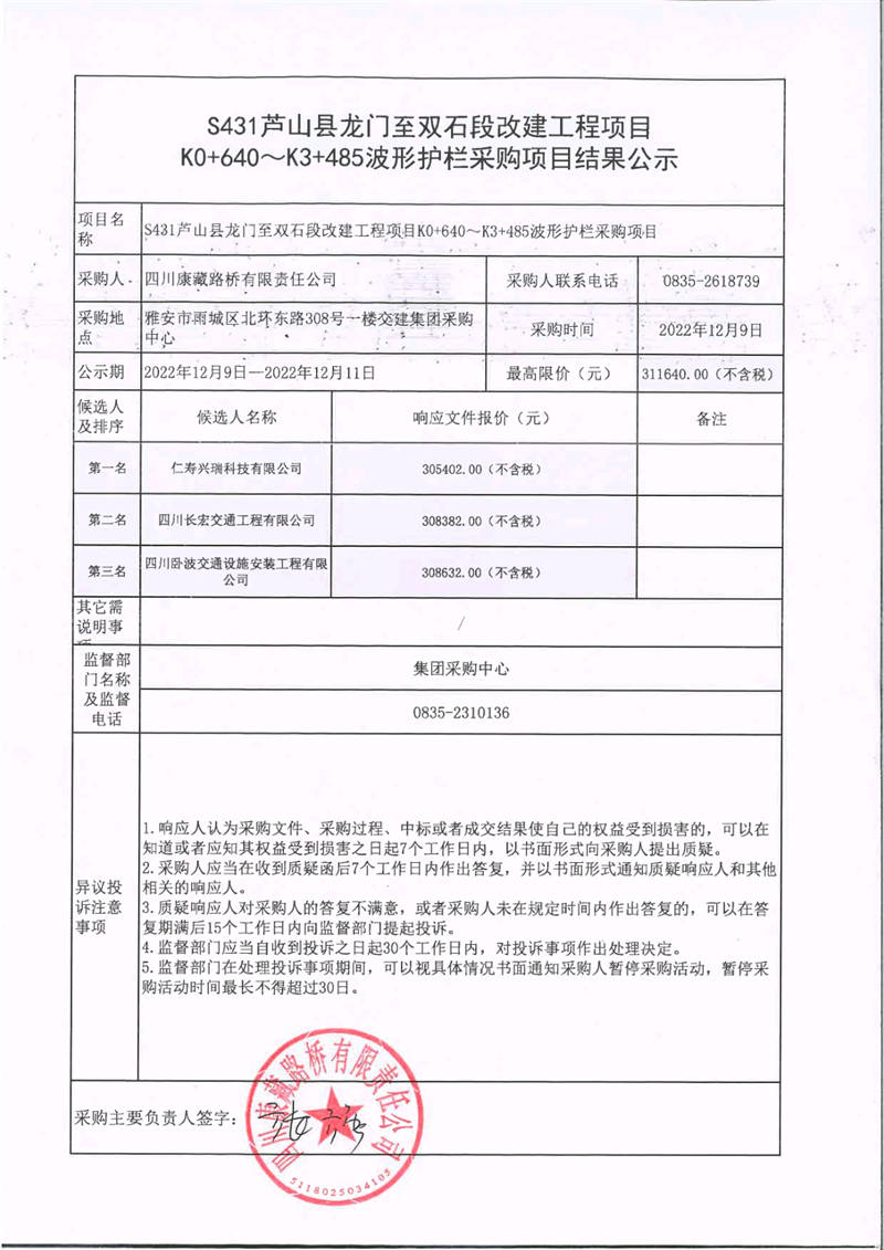 四川康藏路橋有限責(zé)任公司S431蘆山縣龍門(mén)至雙石段改建工程項(xiàng)目K0+640~K3+485波形護(hù)欄采購(gòu)項(xiàng)目結(jié)果公示