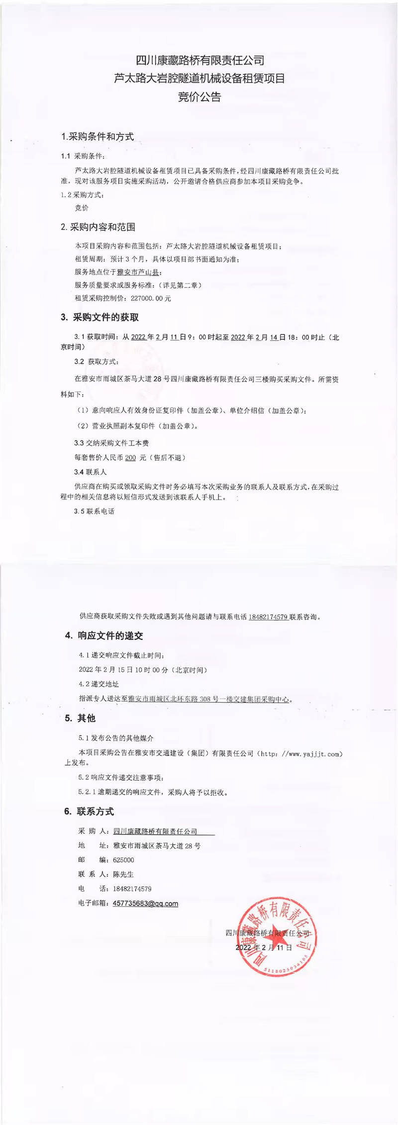 四川康藏路橋有限責任公司蘆太路大巖腔隧道機械設(shè)備租賃項目競價公告