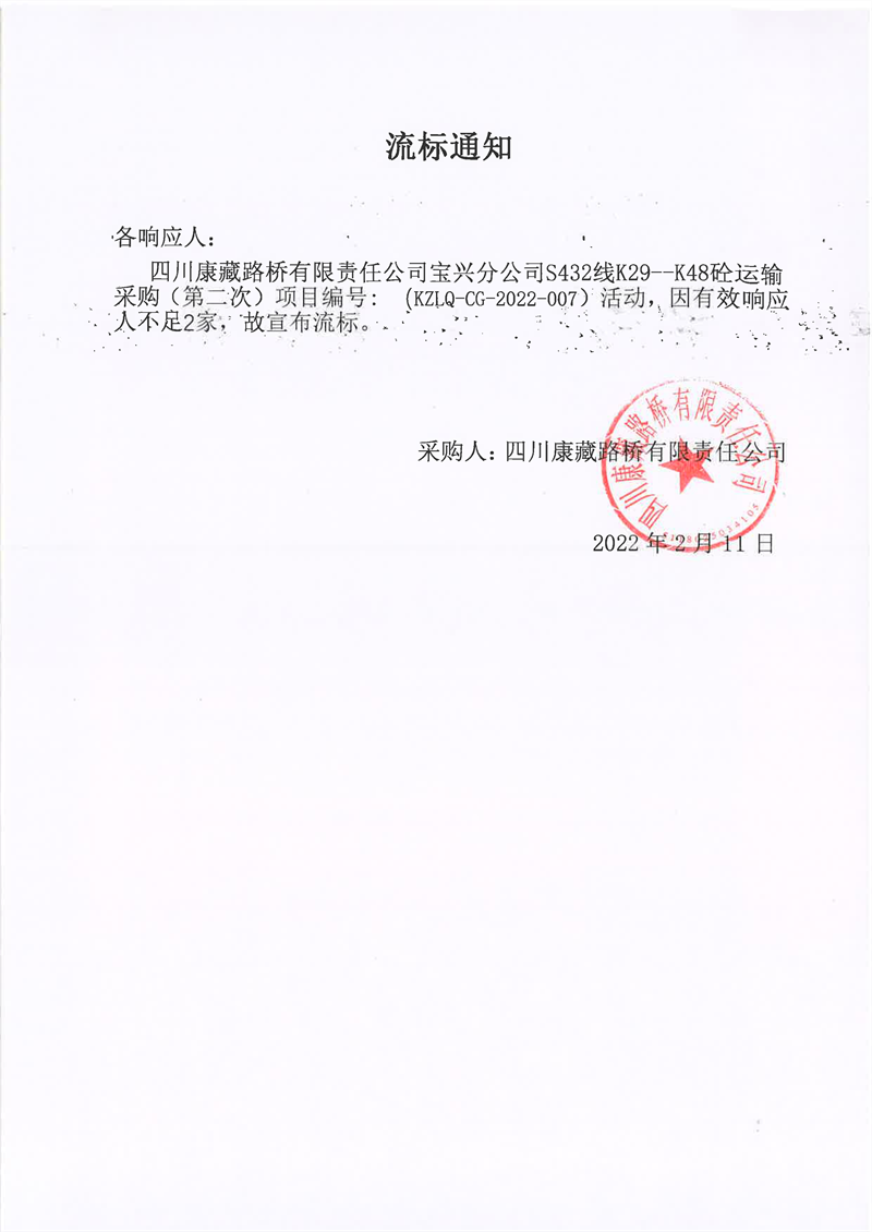 四川康藏路橋有限責(zé)任公司寶興分公司S432線K29-K48砼運輸采購(第二次)項目流標通知