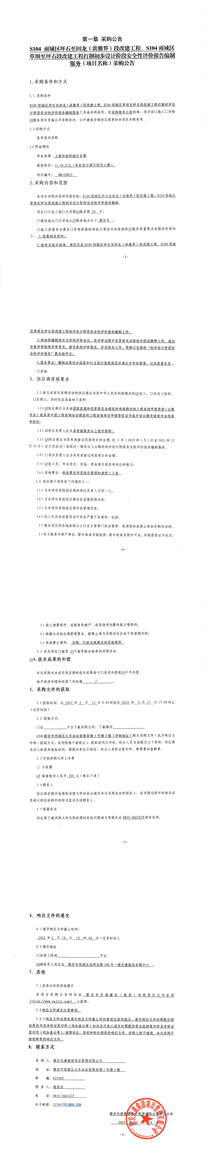雅安交建集團(tuán)項(xiàng)目管理有限公司S104雨城區(qū)坪石至回龍(洪雅界)段改建工程、S104雨城區(qū)草壩至坪石段改建工程打捆初步設(shè)計(jì)階段安全性評價(jià)報(bào)告編制服務(wù)采購公告