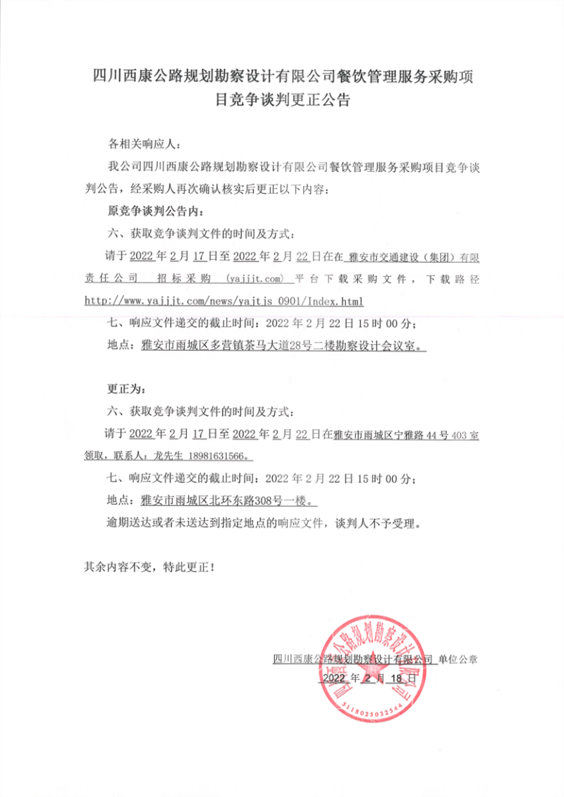 四川西康公路規(guī)劃勘察設(shè)計(jì)有限公司餐飲管理服務(wù)采購項(xiàng)目競爭談判更正公告