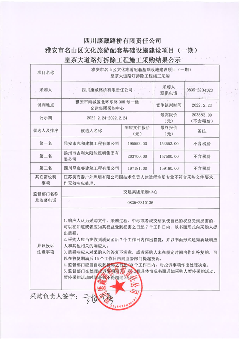 四川康藏路橋有限責(zé)任公司雅安市名山區(qū)文化旅游配套基礎(chǔ)設(shè)施建設(shè)項(xiàng)目(一期)皇茶大道路燈拆除工程施工采購(gòu)結(jié)果公示