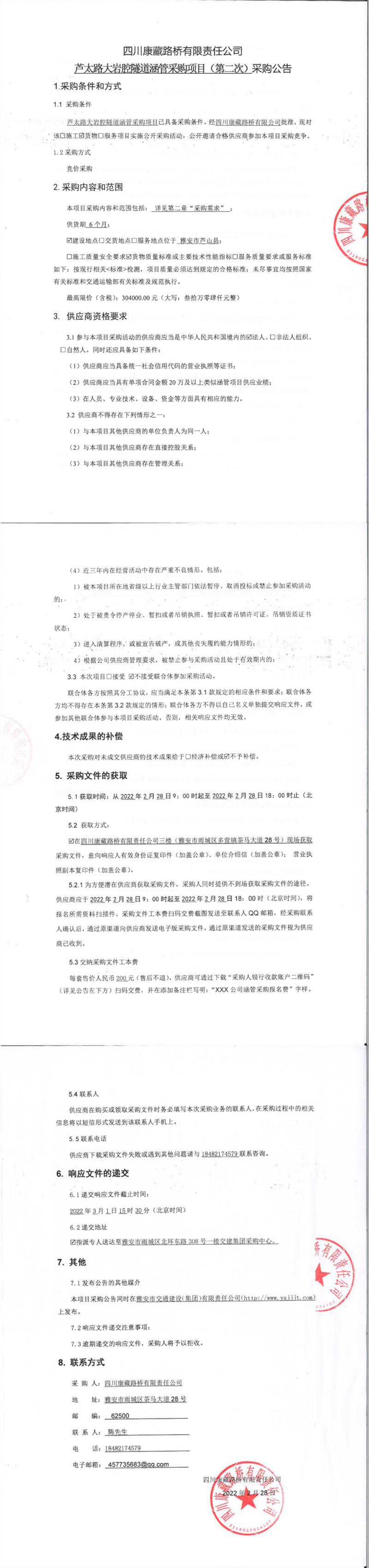 四川康藏路橋有限責(zé)任公司蘆太路大巖腔隧道涵管采購(gòu)項(xiàng)目(第二次)采購(gòu)公告