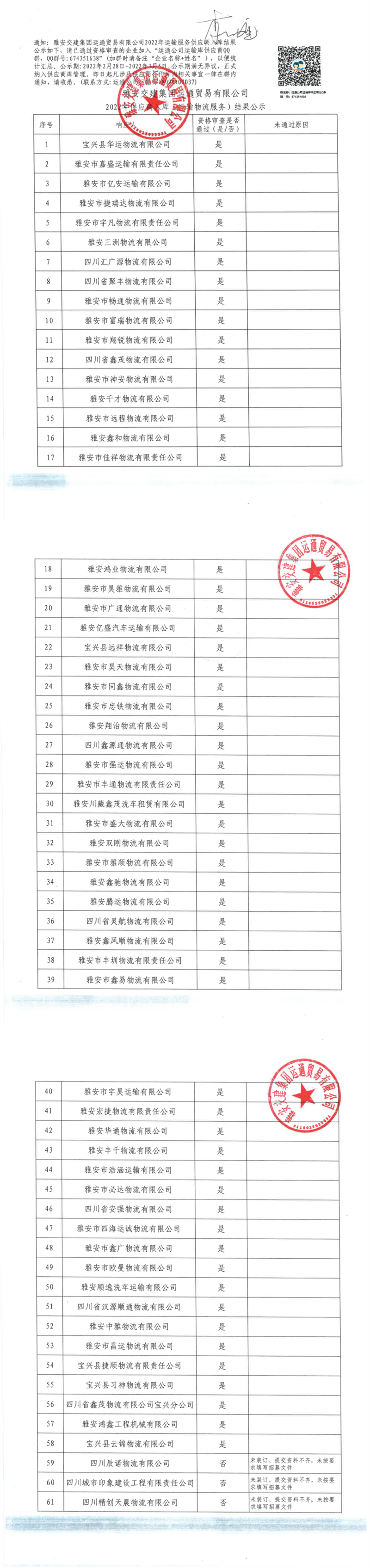 雅安交建集團(tuán)運通貿(mào)易有限公司2022年供應(yīng)商入庫(運輸物流服務(wù))結(jié)果公示