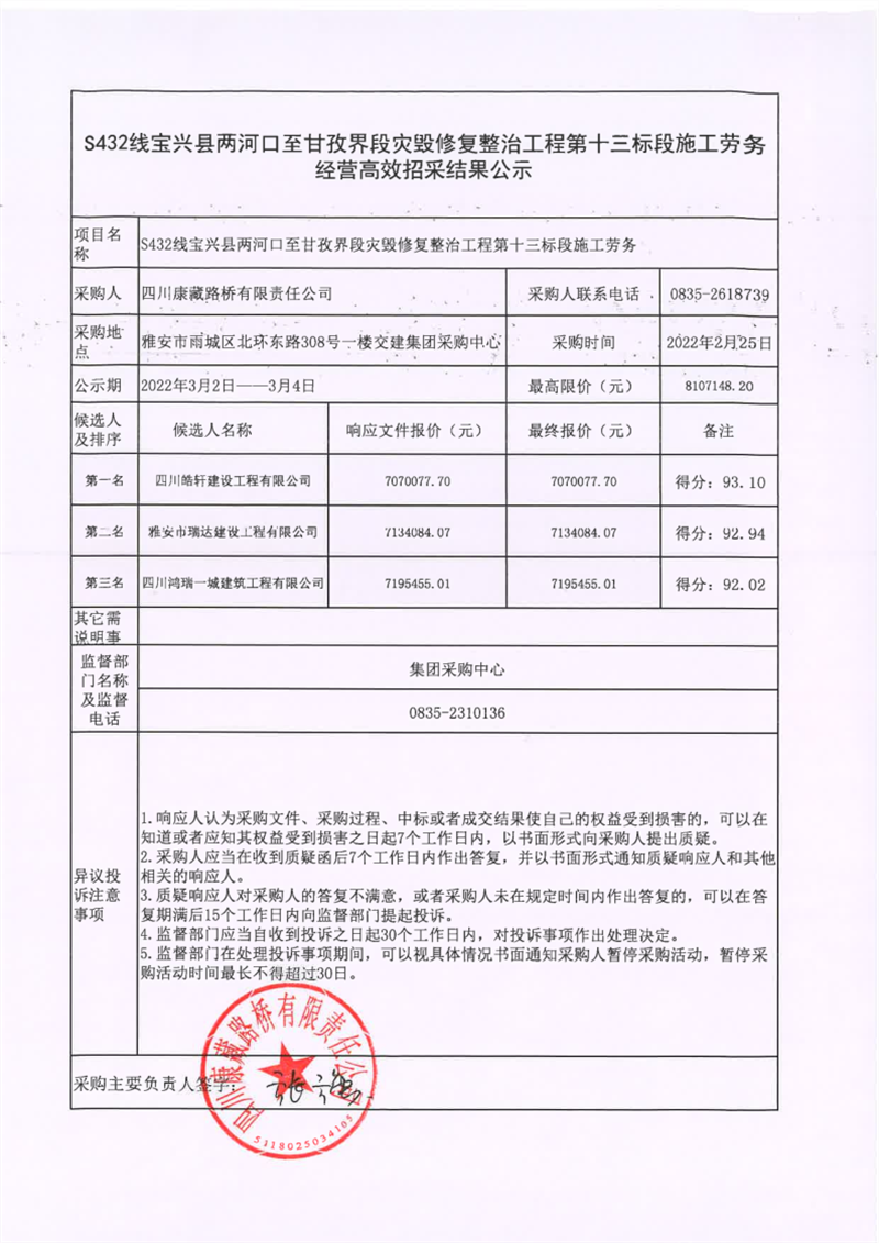 四川康藏路橋有限責(zé)任公司S432線寶興縣兩河口至甘孜界段災(zāi)毀修復(fù)整治工程第十三標(biāo)段施工勞務(wù)經(jīng)營高效招采結(jié)果公示