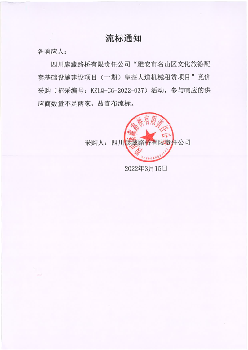 四川康藏路橋有限責(zé)任公司雅安市名山區(qū)文化旅游配套基礎(chǔ)設(shè)施建設(shè)項目(一期)皇茶大道機(jī)械租賃項目流標(biāo)通知