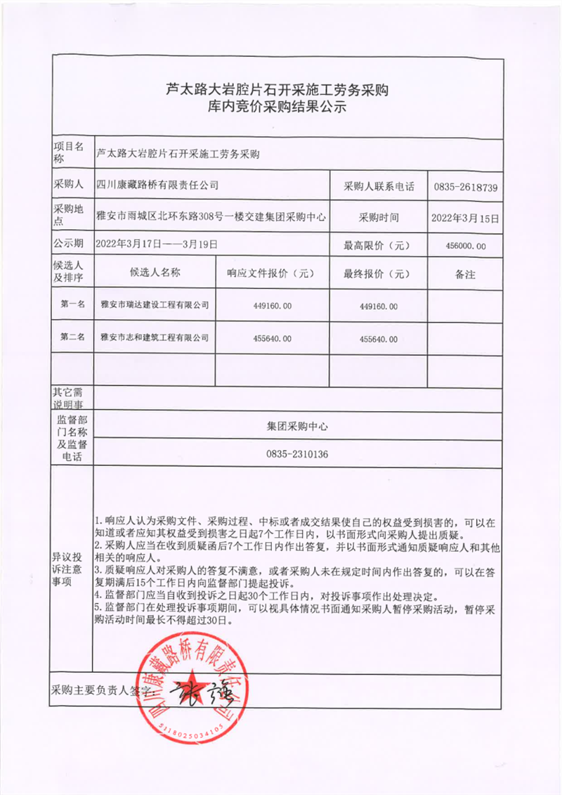 四川康藏路橋有限責任公司蘆太路大巖腔片石開采施工勞務(wù)采購庫內(nèi)競價采購結(jié)果公示