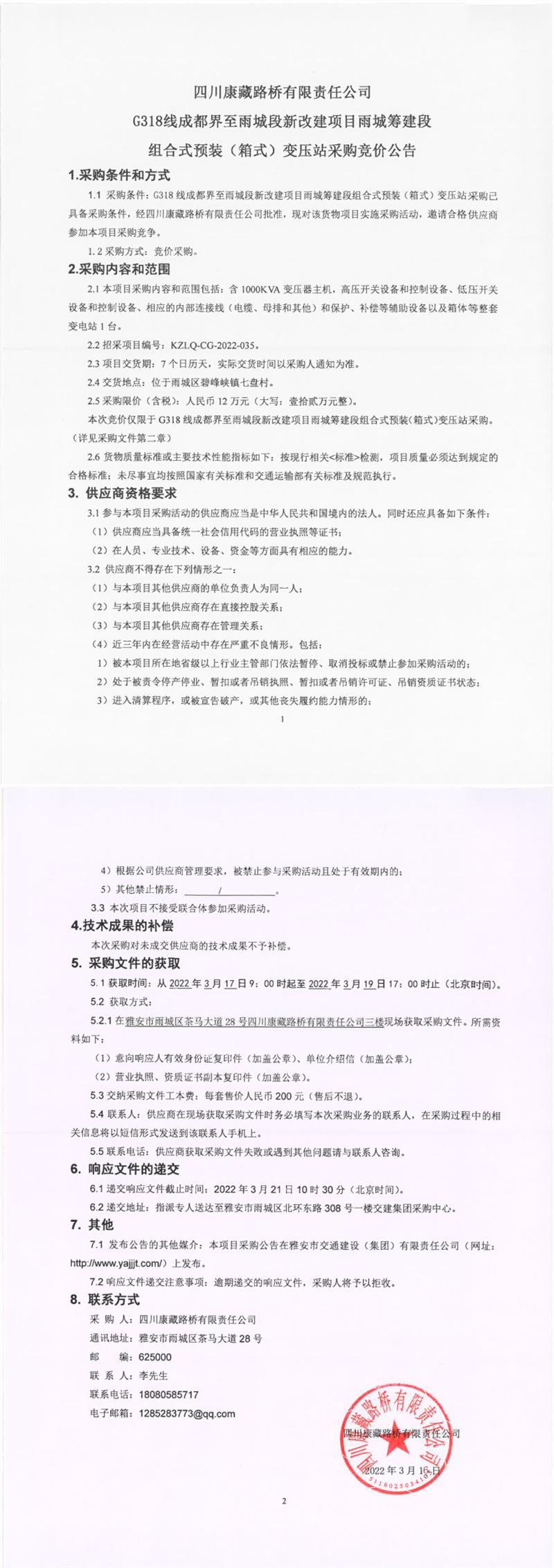 四川康藏路橋有限責(zé)任公司G318線成都界至雨城段新改建項目雨城籌建段組合式預(yù)裝(箱式)變壓站采購競價公告