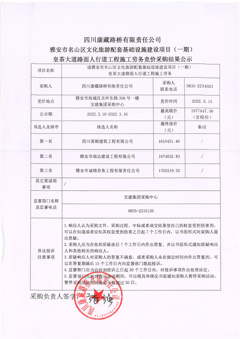 四川康藏路橋有限責任公司雅安市名山區(qū)文化旅游配套基礎設施建設項目(一期)皇茶大道路面人行道工程施工勞務競價采購結果公示