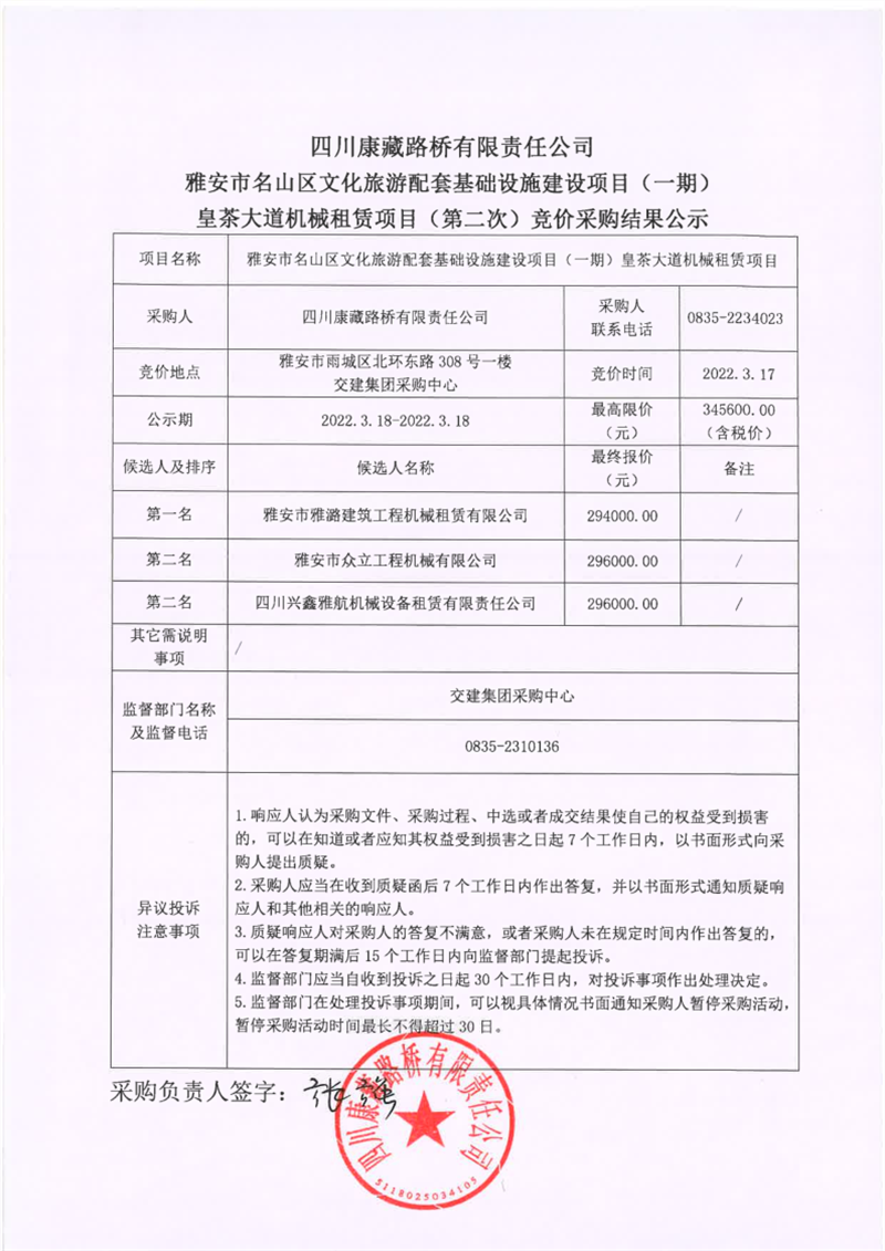 四川康藏路橋有限責(zé)任公司雅安市名山區(qū)文化旅游配套基礎(chǔ)設(shè)施建設(shè)項目(一期)皇茶大道機(jī)械租賃項目(第二次)競價采購結(jié)果公示