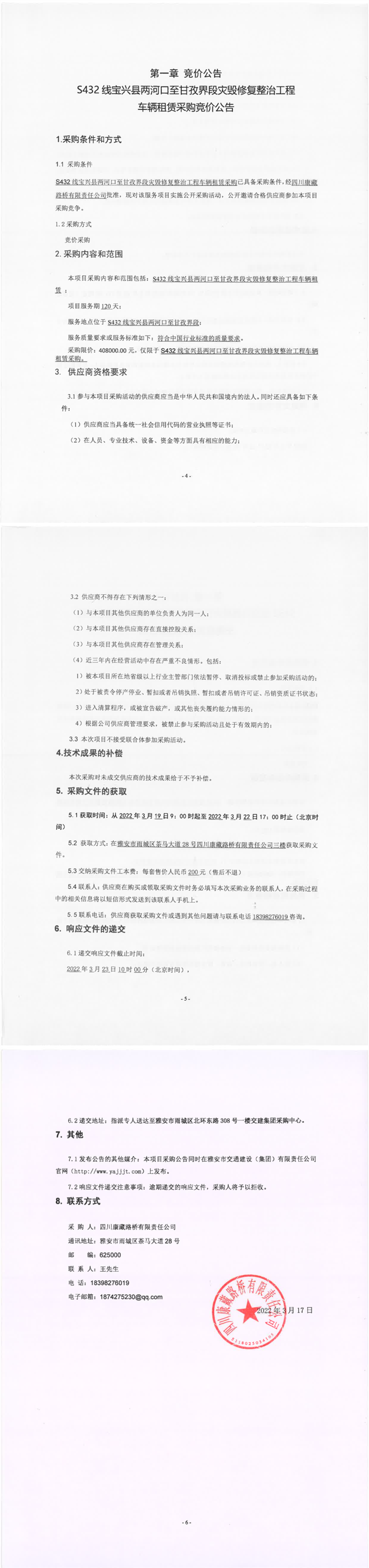 四川康藏路橋有限責任公司S432線寶興縣兩河口至甘孜界段災毀修復整治工程車輛租賃采購競價公告