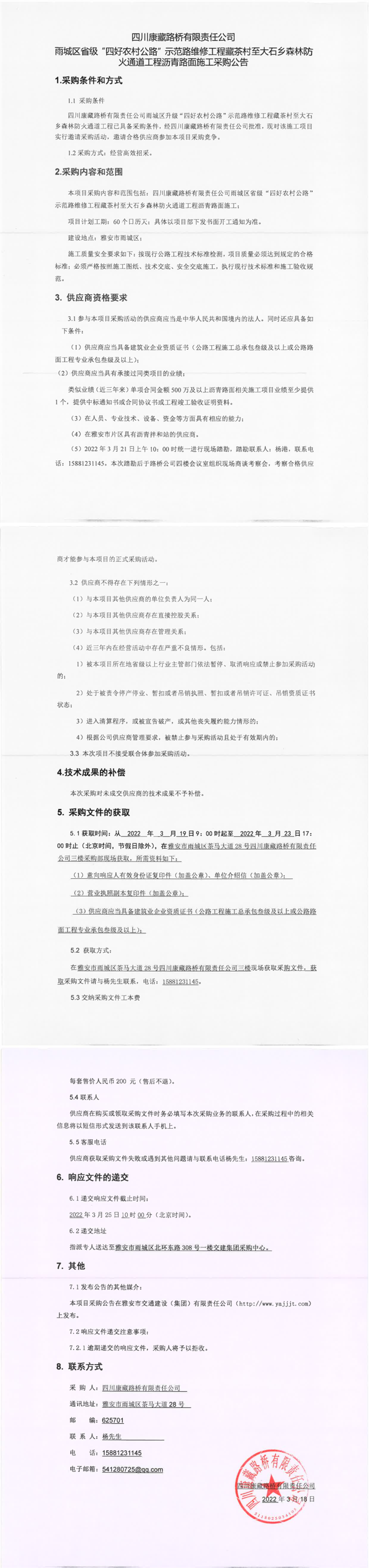 四川康藏路橋有限責(zé)任公司雨城區(qū)省級(jí)“四好農(nóng)村公路”示范路維修工程藏茶村至大石鄉(xiāng)森林防火通道工程瀝青路面施工采購(gòu)公告