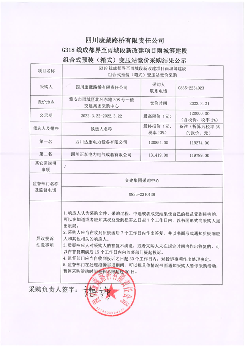 四川康藏路橋有限責(zé)任公司G318線成都界至雨城段新改建項(xiàng)目雨城籌建段組合式預(yù)裝(箱式)變壓站競(jìng)價(jià)采購(gòu)結(jié)果公示