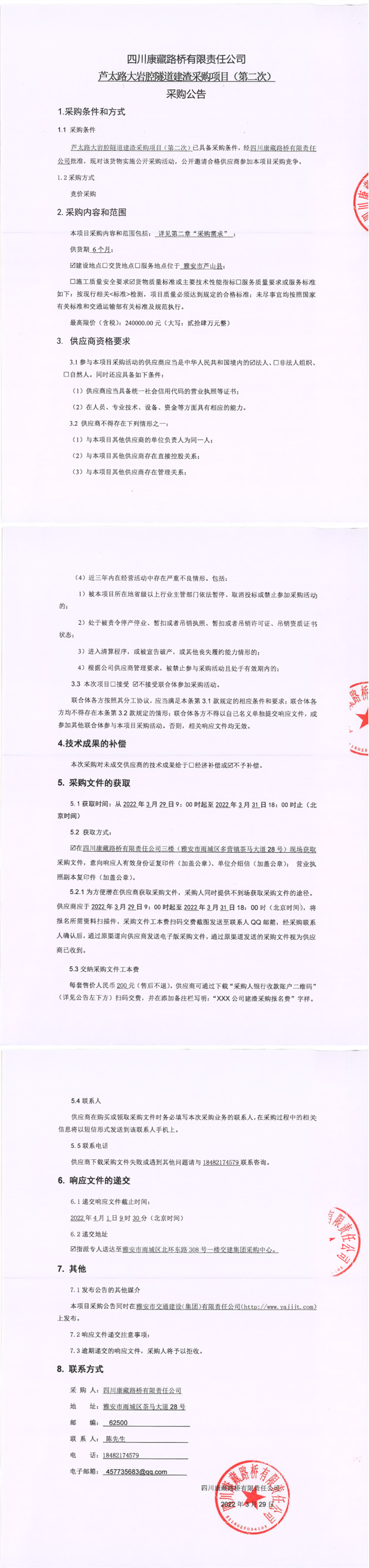 四川康藏路橋有限責任公司蘆太路大巖腔隧道建渣采購項目(第二次)采購公告