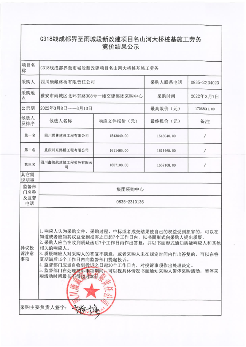 四川康藏路橋有限責(zé)任公司G318線成都界至雨城段新改建項目名山河大橋樁基施工勞務(wù)競價結(jié)果公示