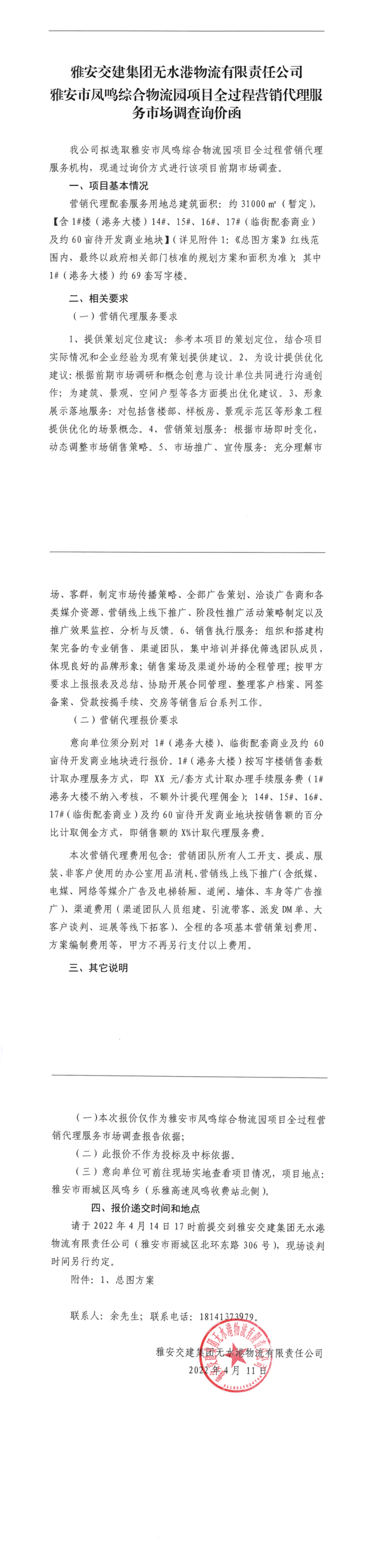 雅安交建集團(tuán)無(wú)水港物流有限責(zé)任公司雅安市鳳鳴綜合物流園項(xiàng)目全過(guò)程營(yíng)銷(xiāo)代理服務(wù)市場(chǎng)調(diào)查詢(xún)價(jià)函