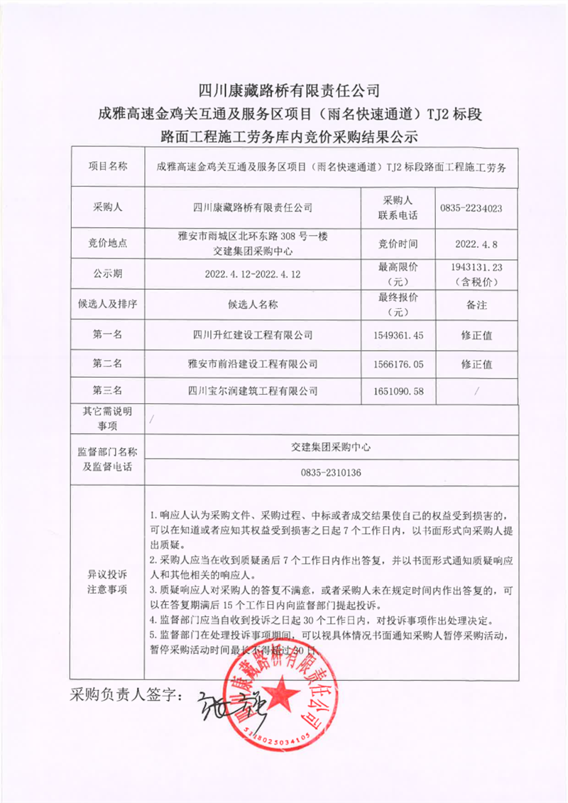 四川康藏路橋有限責(zé)任公司成雅高速金雞關(guān)互通及服務(wù)區(qū)項(xiàng)目(雨名快速通道)TJ2標(biāo)段路面工程施工勞務(wù)庫內(nèi)競(jìng)價(jià)采購(gòu)結(jié)果公示