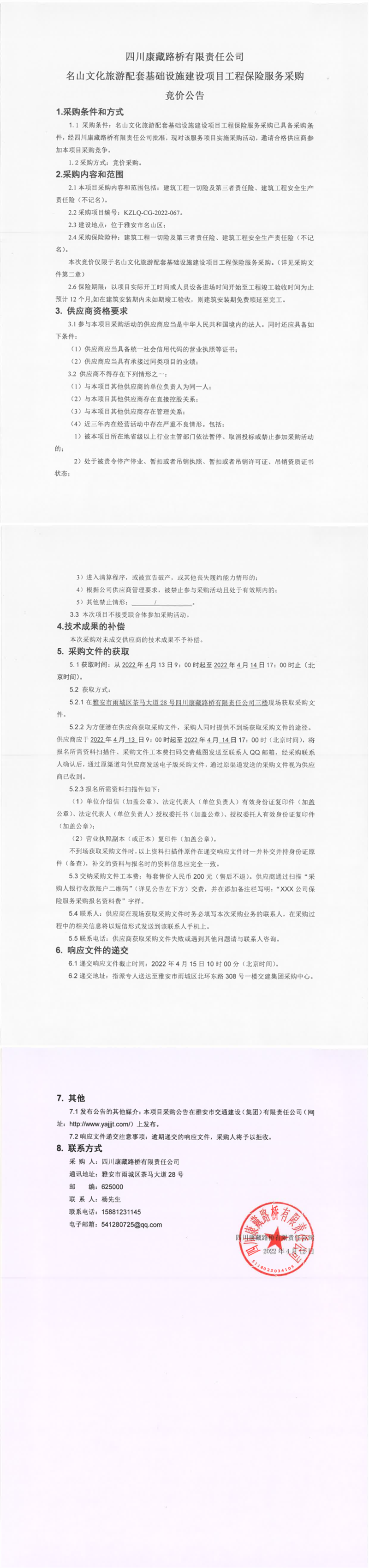 四川康藏路橋有限責(zé)任公司名山文化旅游配套基礎(chǔ)設(shè)施建設(shè)項目工程保險服務(wù)采購競價公告