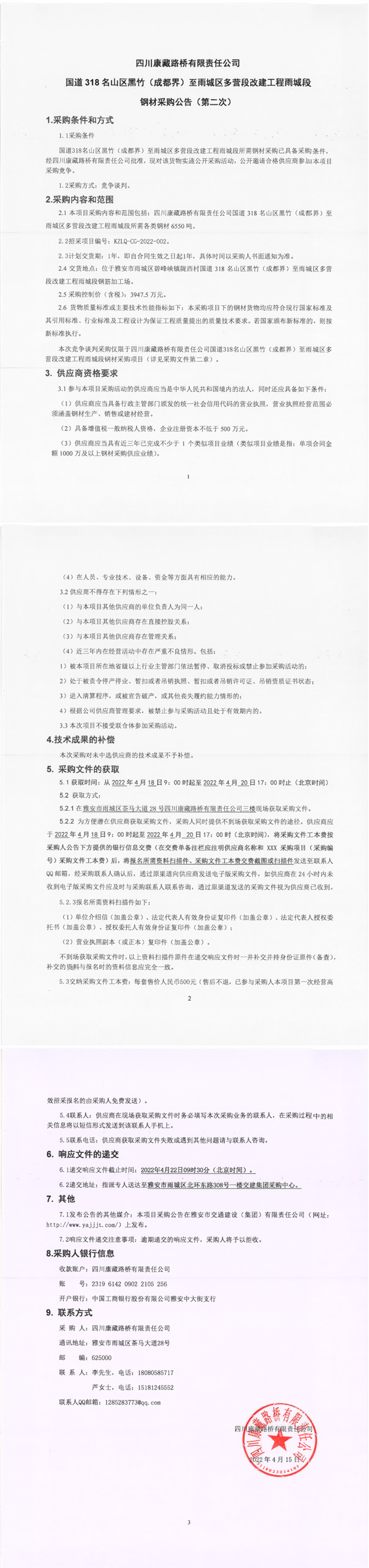 四川康藏路橋有限責(zé)任公司國道318名山區(qū)黑竹(成都界)至雨城區(qū)多營段改建工程雨城段鋼材采購公告(第二次)